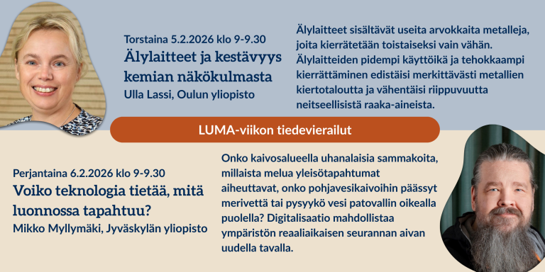 Älylaitteet sisältävät useita arvokkaita metalleja, joita kierrätetään toistaiseksi vain vähän. Älylaitteiden pidempi käyttöikä ja tehokkaampi kierrättäminen edistäisi merkittävästi metallien kiertotaloutta ja vähentäisi riippuvuutta neitseellisistä raaka-aineista. - Pe 6.2. klo 9.00-9.30 Voiko teknologia tietää, mitä luonnossa tapahtuu? Informaatioteknologian tutkimuskoordinaattori Mikko Myllymäki.